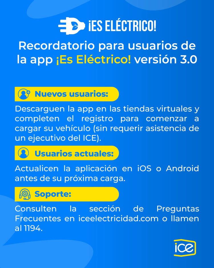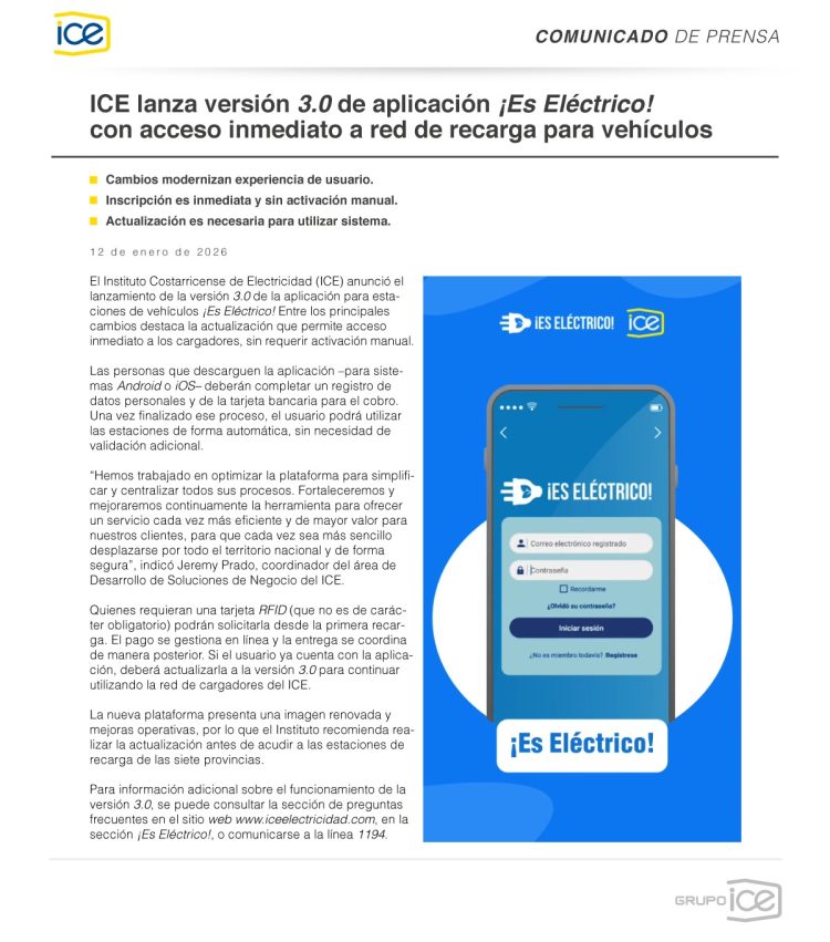 El Instituto Costarricense de Electricidad (ICE) anunció el lanzamiento de la versión 3.0 de la aplicación para estaciones de vehículos ¡Es Eléctrico! Entre los principales cambios destaca la actualización que permite acceso inmediato a los cargadores, sin requerir activación manual.