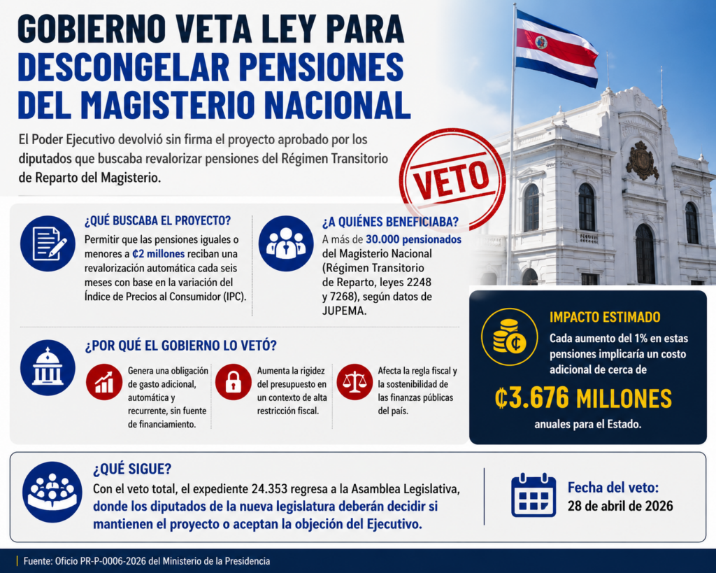 En el documento de veto se cita información de la Junta de Pensiones y Jubilaciones del Magisterio Nacional (JUPEMA), según la cual el beneficio alcanzaría a más de 30.000 pensionados. Además, cada incremento del 1% en esas jubilaciones tendría un costo anual adicional cercano a ₡3.676 millones (¢2.846 millones Ley 2248 y ¢830 millones Ley 7268).