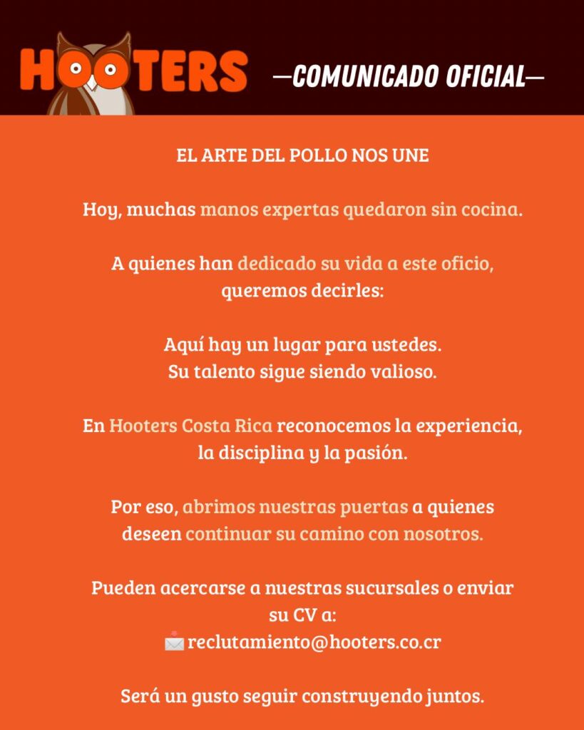 Ante este escenario, Hooters Costa Rica publicó un comunicado en el que abre sus puertas a los exempleados del sector. “Hoy, muchas manos expertas quedaron sin cocina”, señala el mensaje, reconociendo la experiencia y trayectoria de quienes se quedan sin trabajo.