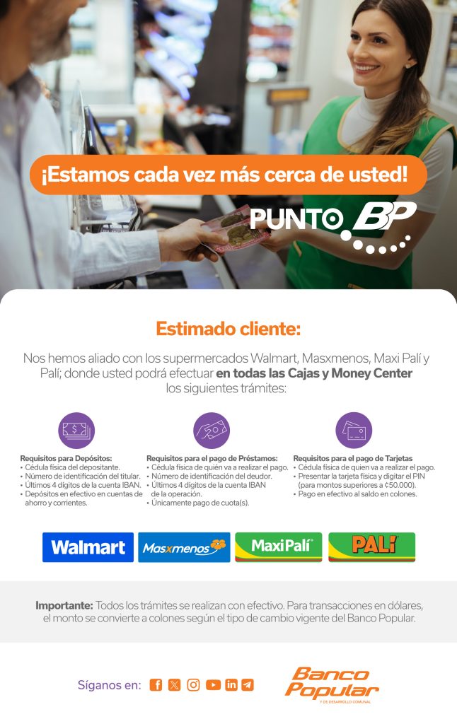 Con este convenio, el Banco Popular se convierte en la primera entidad financiera en Costa Rica en ofrecer este tipo de servicios en todas las cajas de los 339 supermercados de Walmart, en sus distintos formatos: Walmart, MásxMenos, MaxiPalí y Palí, así como en los 59 Money Center ubicados en todo el territorio nacional.