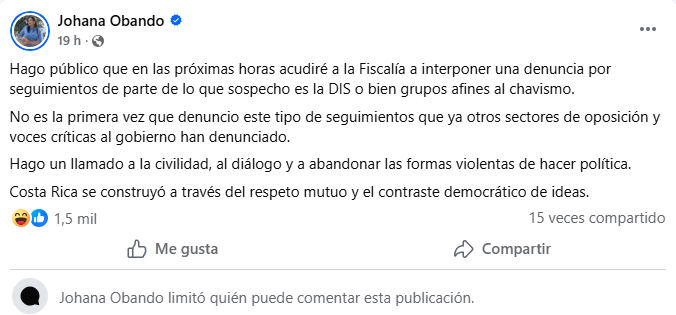 La diputada independiente Johana Obando anunció que acudirá a la Fiscalía para interponer una denuncia por presuntos seguimientos en su contra, los cuales atribuye, de forma preliminar, a la Dirección de Inteligencia y Seguridad (DIS) o a grupos afines al oficialismo.