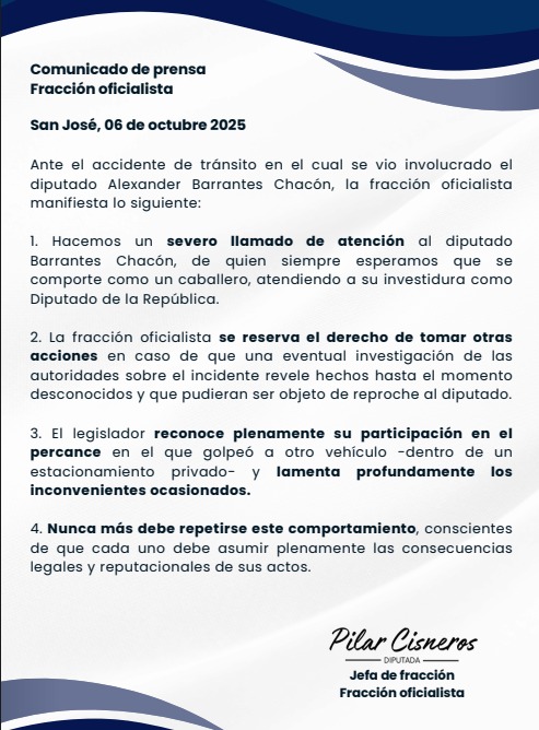 La fracción oficialista de la Asamblea Legislativa emitió un comunicado de prensa este lunes, en el que confirma que el diputado Alexander Barrantes Chacón fue objeto de un llamado de atención luego de verse involucrado en un accidente de tránsito.
