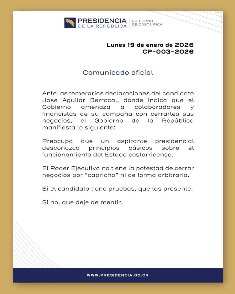 El Gobierno de la República rechazó este lunes las declaraciones del candidato presidencial José Aguilar Berrocal, quien afirmó públicamente que el Poder Ejecutivo estaría amenazando a colaboradores y financistas de su campaña con el cierre de sus negocios. La posición oficial fue comunicada mediante un comunicado de Presidencia, fechado el 19 de enero de 2026.