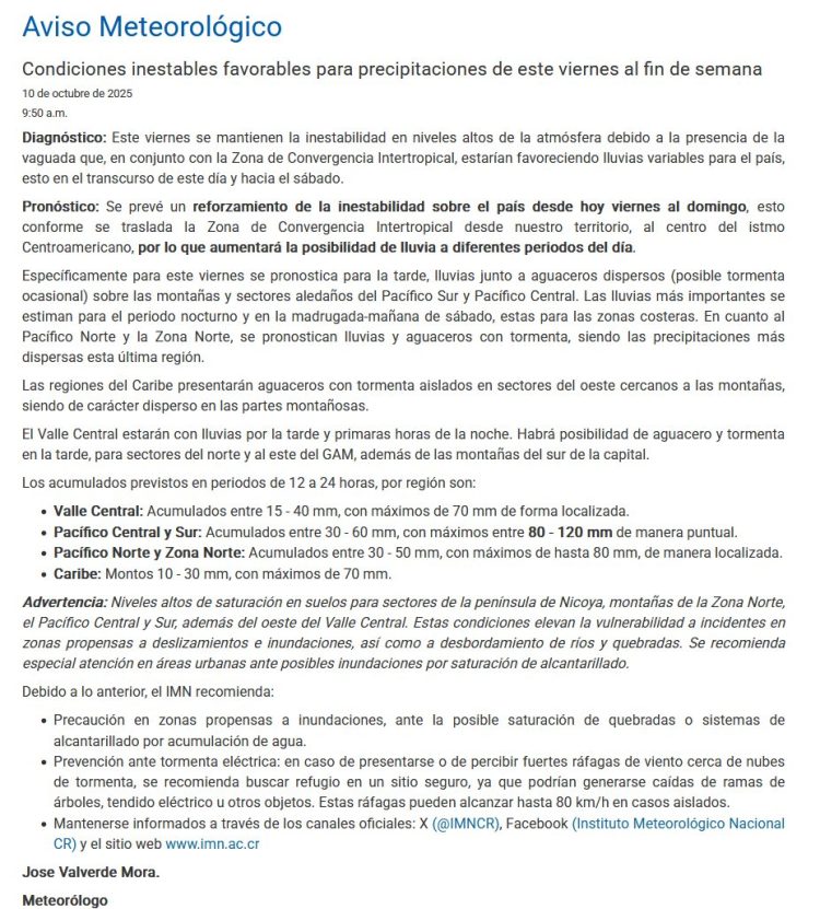 El Instituto Meteorológico Nacional (IMN) advirtió que el país enfrentará condiciones inestables con lluvias y tormentas eléctricas durante este fin de semana del 10 al 12 de octubre, debido al desplazamiento de la Zona de Convergencia Intertropical y la presencia de una vaguada en niveles altos de la atmósfera.