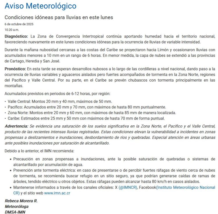 “Las condiciones actuales favorecen la ocurrencia de eventos por acumulación de agua y saturación de suelos. Se recomienda especial precaución en sectores propensos a inundaciones y deslizamientos”, señaló la meteoróloga Rebeca Morera R., del DMSA-IMN.