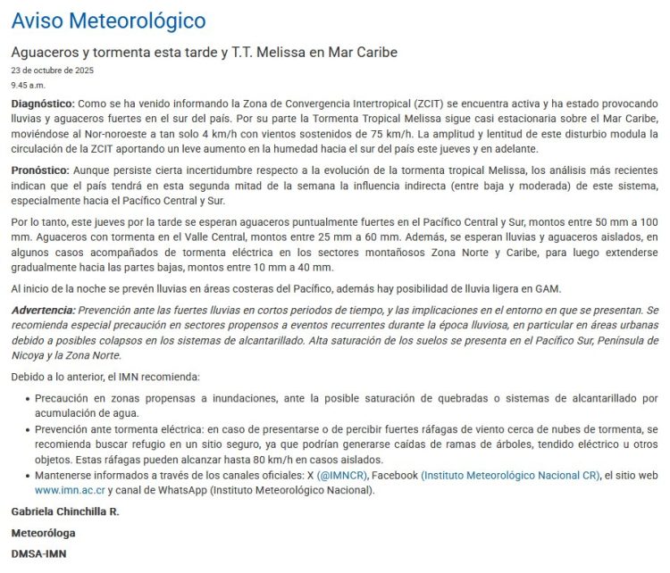 El Instituto Meteorológico Nacional (IMN) informó que la Zona de Convergencia Intertropical (ZCIT) se mantiene activa y continúa generando lluvias y aguaceros fuertes en el sur de Costa Rica. A esto se suma la influencia indirecta de la Tormenta Tropical Melissa, que permanece casi estacionaria sobre el Mar Caribe y podría intensificar las condiciones lluviosas durante los próximos días, especialmente en el Pacífico Central y Sur.