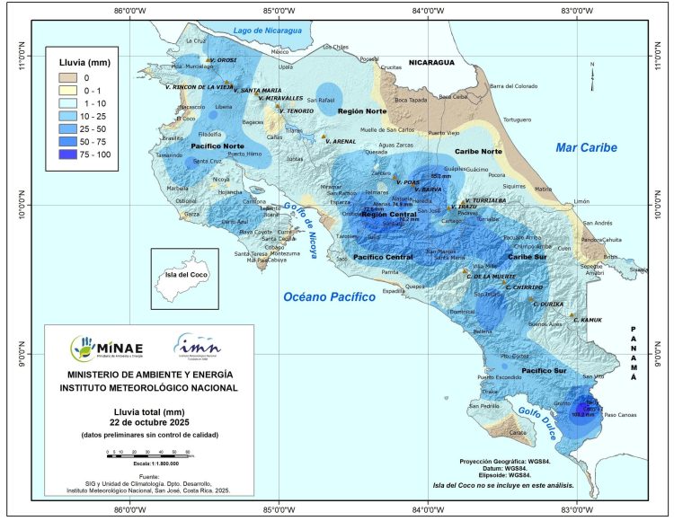 La institución advirtió sobre el riesgo de inundaciones y deslizamientos debido a la alta saturación de los suelos, particularmente en el Pacífico Sur, Península de Nicoya y Zona Norte. Asimismo, recomendó precaución ante posibles ráfagas de viento de hasta 80 km/h, buscar refugio seguro durante tormentas eléctricas y mantenerse informados por medio de los canales oficiales del IMN.