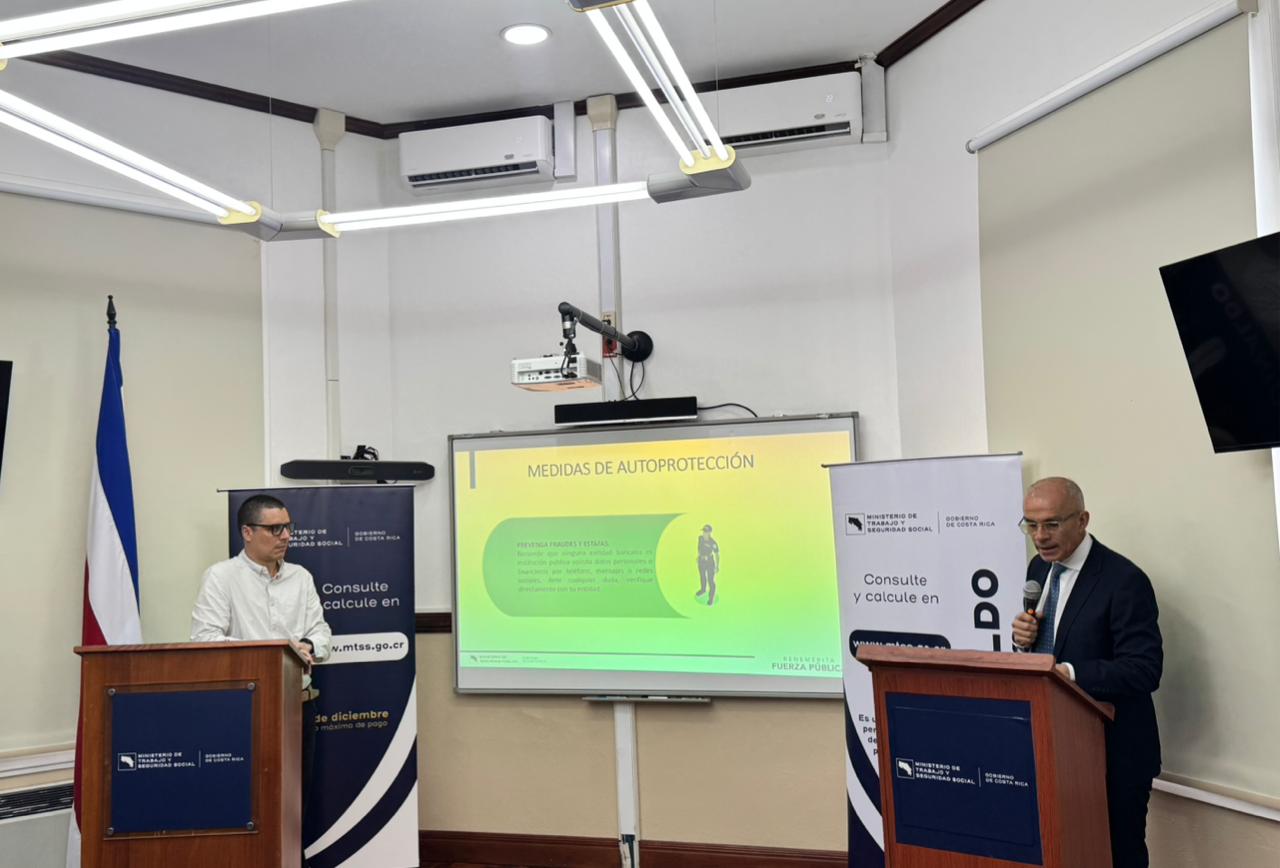 El ministro de Seguridad Pública, Mario Zamora, participó también en la conferencia para presentar la “Operación Nacional Centinela Navideño”, que difundirá recomendaciones para evitar fraudes, proteger bienes y reforzar medidas preventivas durante la temporada en que la población recibe este ingreso.