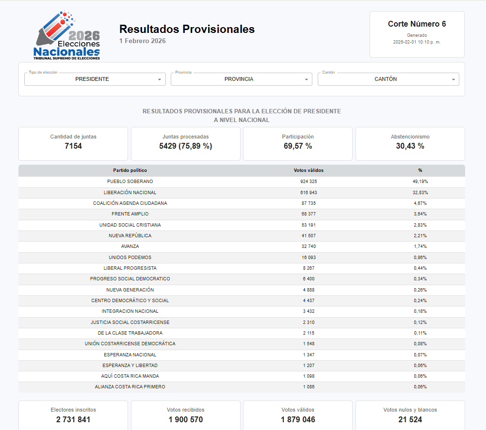 Con el 69,40 % de las juntas receptoras de votos procesadas, Laura Fernández, candidata del Partido Pueblo Soberano (PPSO), encabeza los resultados preliminares de las elecciones presidenciales con un 49,19 % de los votos válidos.
