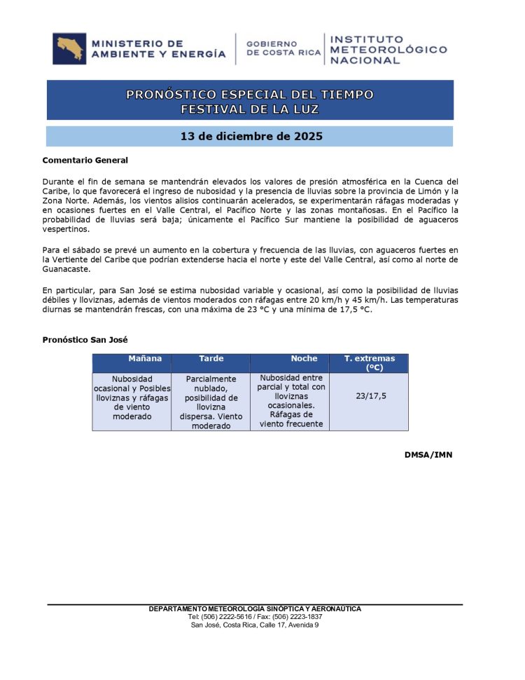Si tiene pensado ir al Festival de la Luz, este es el pronóstico del tiempo que viene con vientos y lloviznas para San José este sábado, esto se debe a la influencia de altos valores de presión atmosférica en la Cuenca del Caribe.