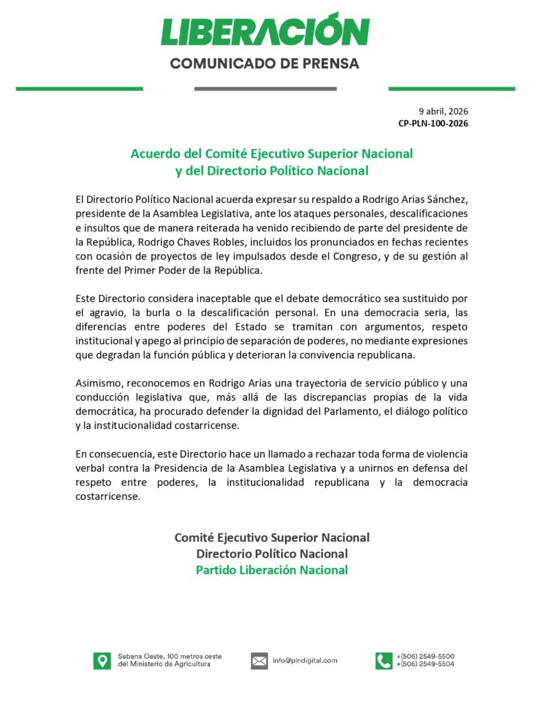 El Directorio Político Nacional del Partido Liberación Nacional (PLN) cerró filas en torno al presidente legislativo Rodrigo Arias y le respondió al mandatario Rodrigo Chaves, al considerar inaceptables los ataques personales y descalificaciones que —según la agrupación— degradan el debate democrático y vulneran el respeto entre poderes del Estado.