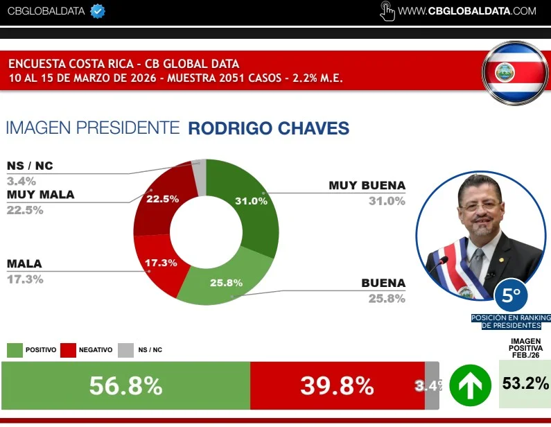 Según el informe de CB Global Data correspondiente a febrero de 2026, el presidente de Costa Rica ya se ubicaba en la quinta posición con un 53,2% de imagen positiva , lo que sugiere una tendencia sostenida en su nivel de aprobación durante los últimos meses de su administración.