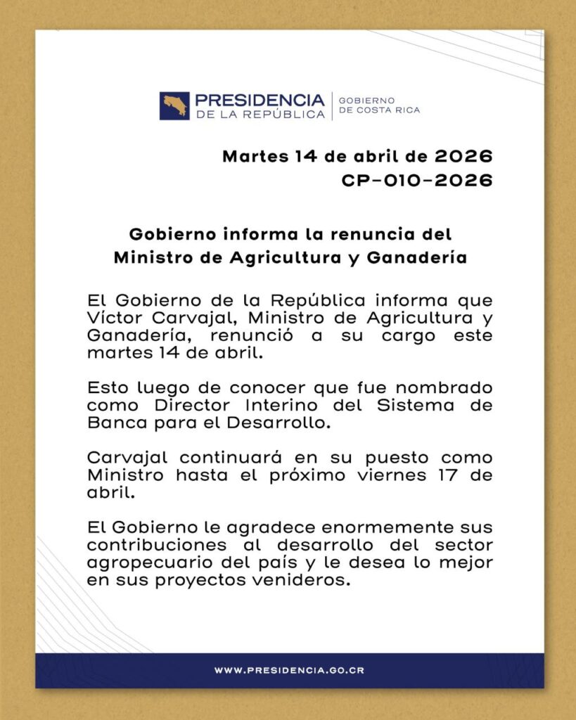 Víctor Carvajal renuncia al Ministerio de Agricultura y Ganadería (MAG), misma que se hace efectiva efectiva este martes 14 de abril, así lo anunció el Gobierno de la República.